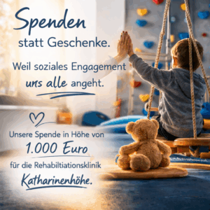 In diesem Jahr ging eine unserer Spenden in Höhe von 1.000 Euro an die Rehabilitationsklinik Katharinenhöhe in Schönwald. Die Klinik begleitet Kinder, Jugendliche und ihre Familien nach schweren Erkrankungen auf dem Weg zurück in den Alltag. Therapeutische Angebote, moderne Therapieeinrichtungen und individuelle Betreuung sind dabei entscheidend für nachhaltige Fortschritte.